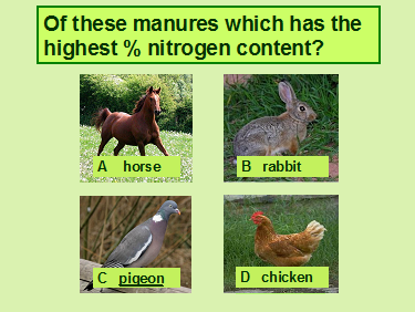 - Horse manure is 0.7% nitrogen, Rabbit manure is 2.4% nitrogen, Pigeon manure is 5.0% nitrogen, Chicken manure is 1.5% nitrogen.